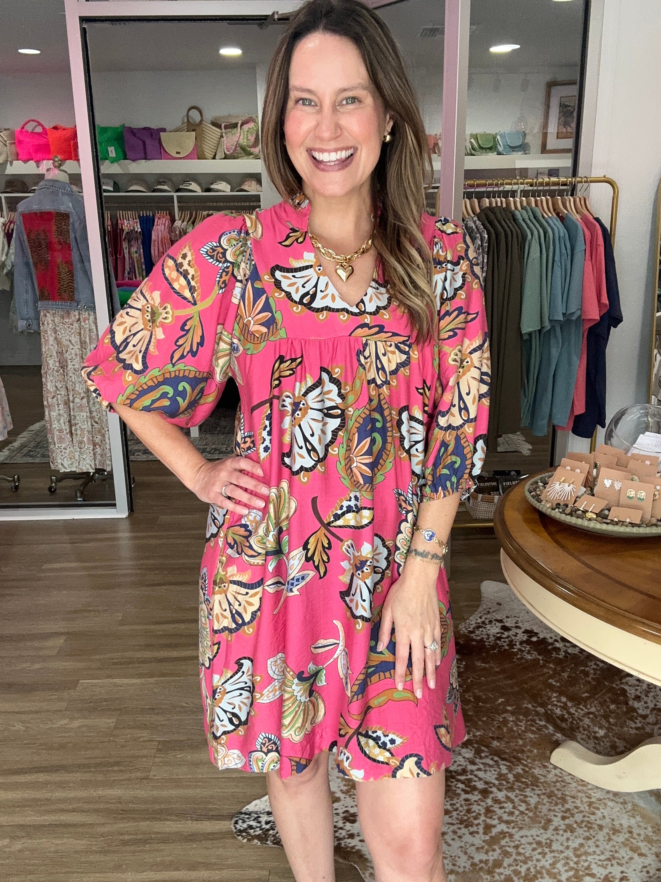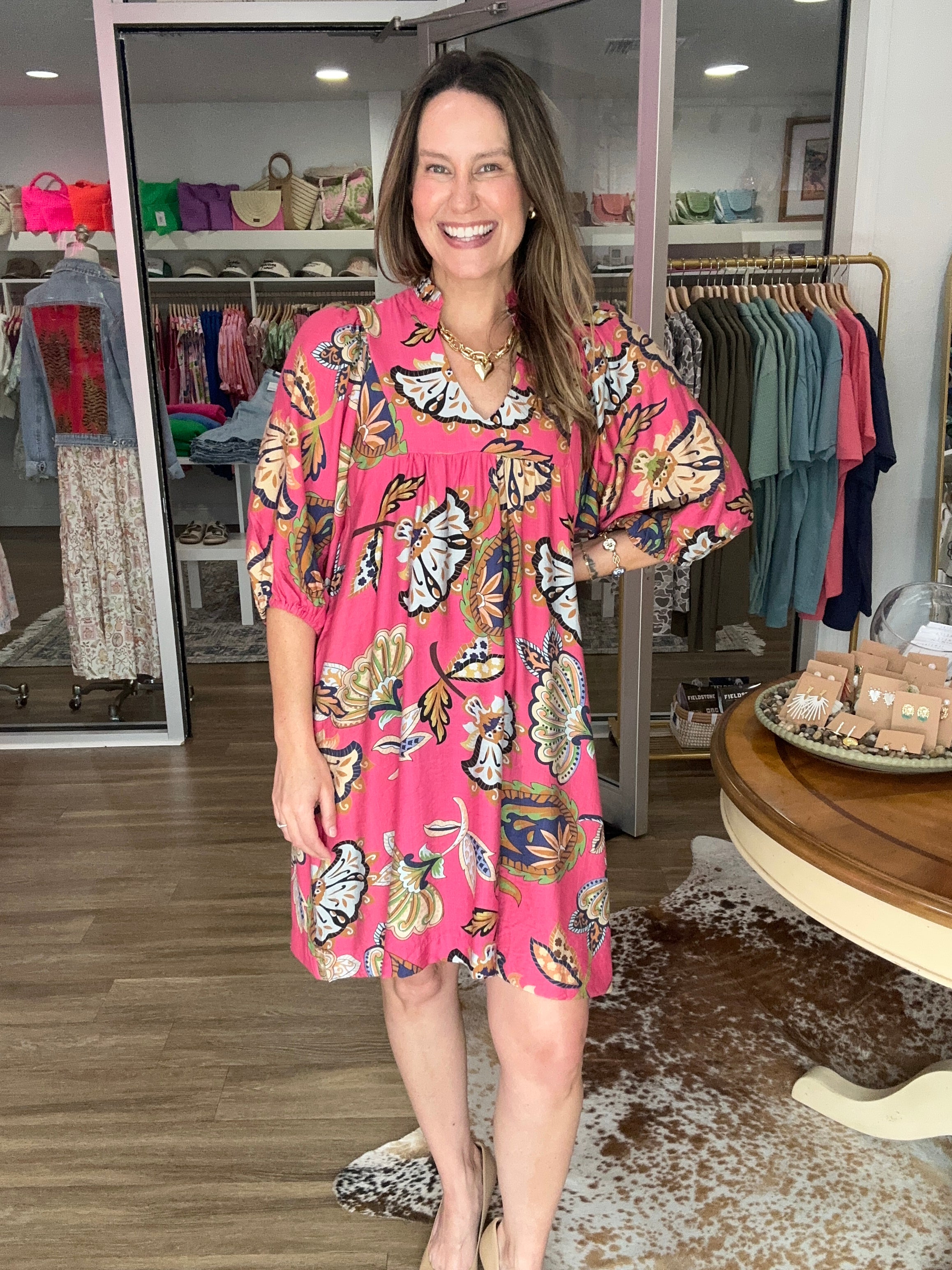 Light and flirty, the Daydream Mini brings soft pink tones and an abstract print together with a ruffled neckline for a playful finish. Its unlined design keeps it breezy and effortless—perfect for warm days when you want a pop of fun and femininity.