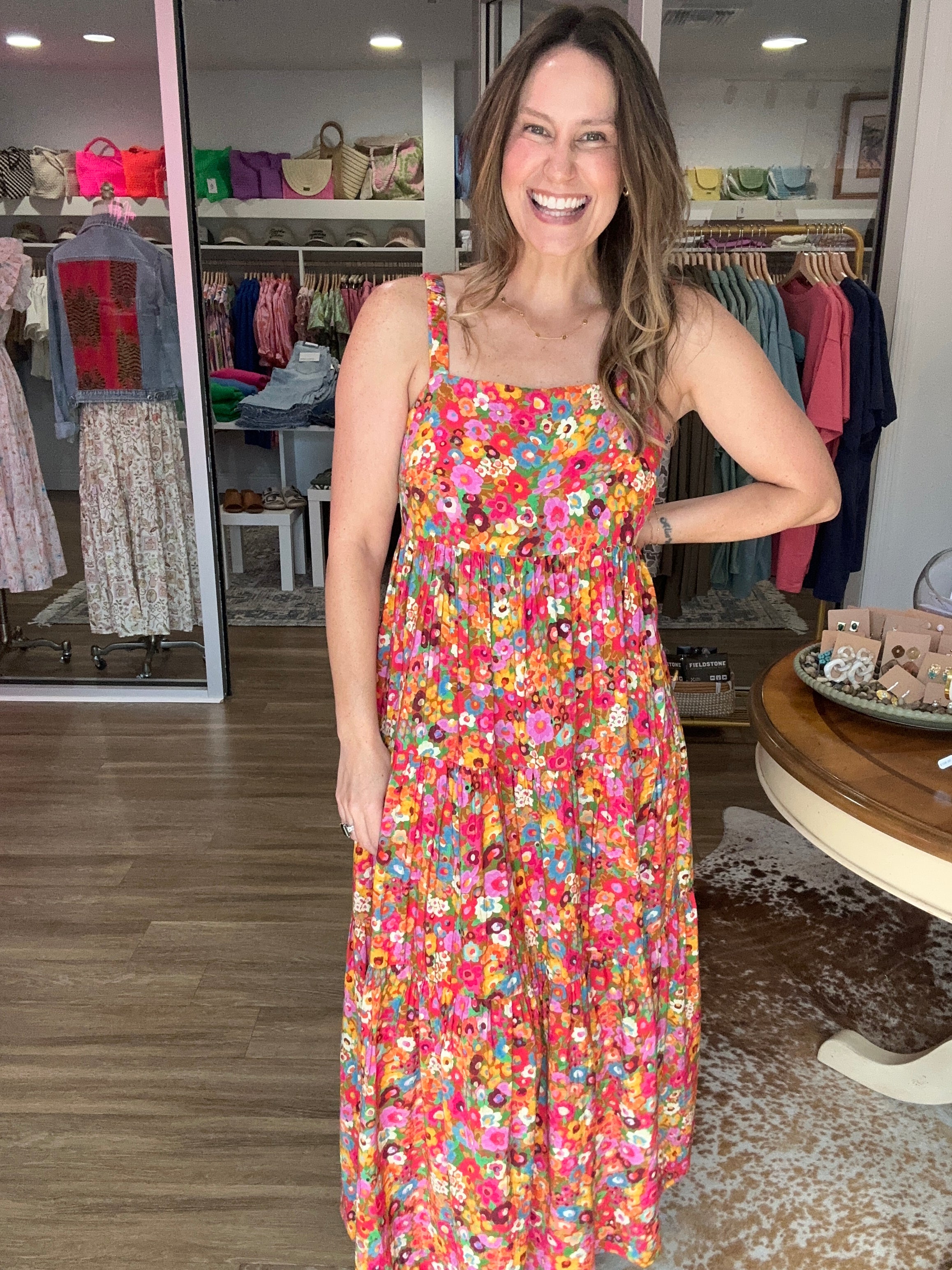 The Valencia Dress is made to turn heads with its vibrant magenta floral design and scoop-back silhouette. Tiered layers create a flowing maxi length that’s both flattering and comfortable—ideal for warm evenings or vacation escapes.