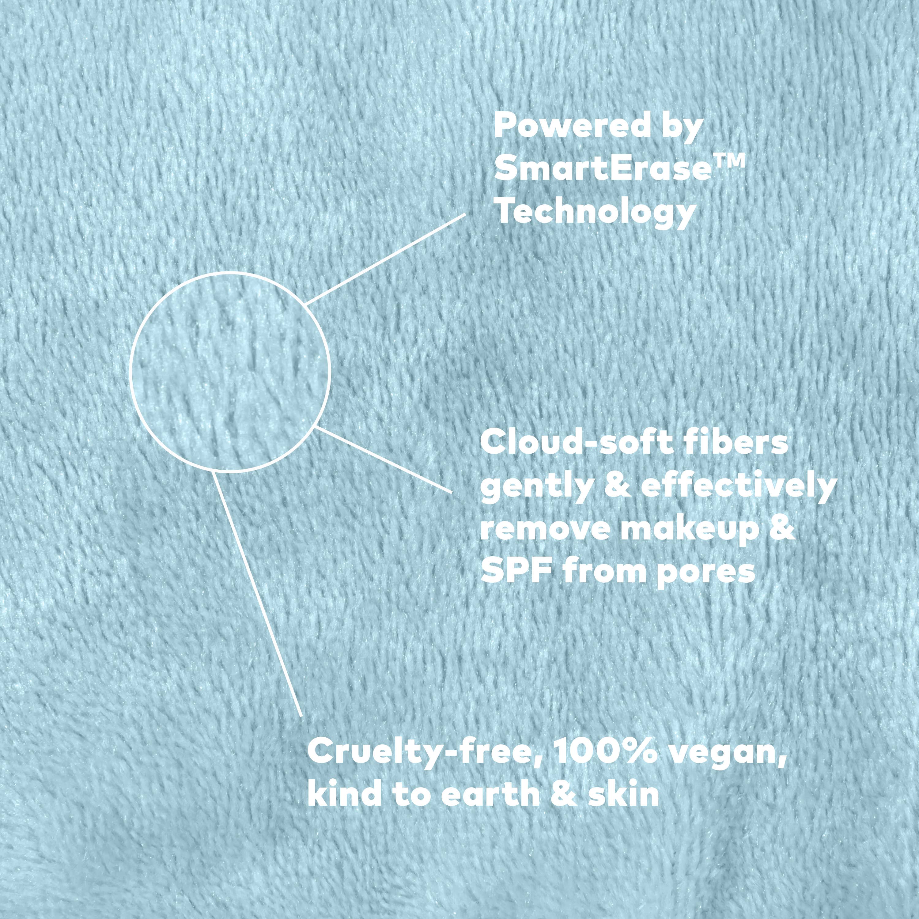 Remove all makeup with JUST WATER™ including waterproof. Our patented, water-activated makeup remover uses cloud-soft fibers to gently & easily remove all cosmetics & sunscreen/SPF from pores. 2 in 1 benefit: Makeup Remover & Exfoliator ✓ Dermatologist Recommended ✓ SmartErase™ Technology ✓ Reusable & machine washable (300X) ✓ Great for everyday & professional makeup removal ✓ Eco-friendly & simplified skincare ✓ TSA The Original MakeUp Eraser® removes makeup 2.5X better than the leading makeup wipe is non-irritating & non-drying, making it perfect for sensitive skin. It's safe for eyelash extensions & oil-free, perfecting your sustainable beauty routine. Wet cloth with warm water. Use gentle circular motions to remove makeup & flip to the other side to exfoliate. Machine wash & dry. Dryer sheet & fabric softener safe.