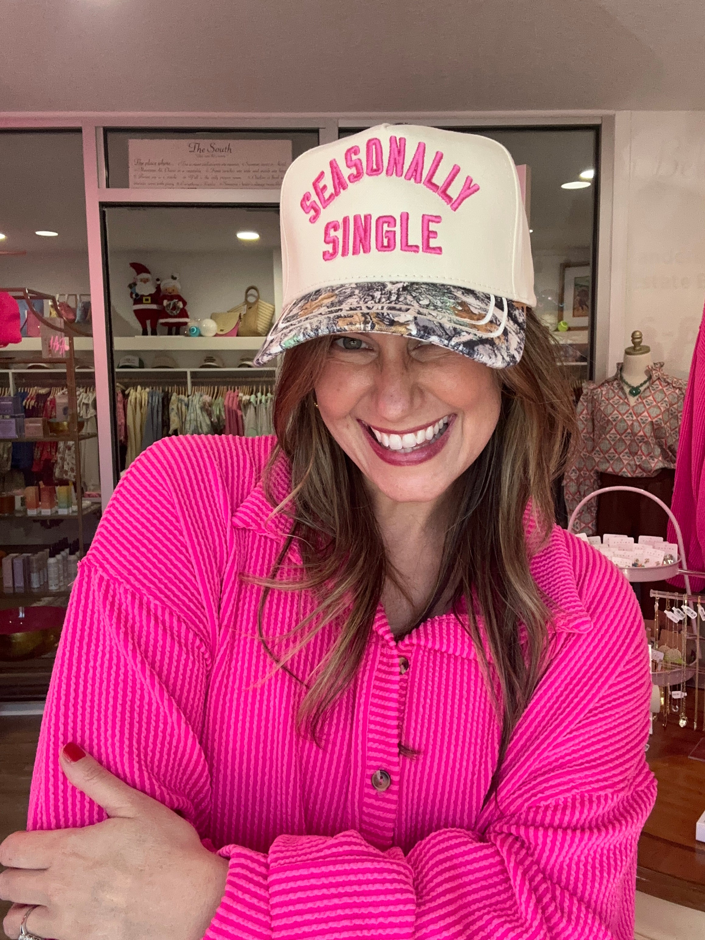 His hobbies are in the woods… yours are looking cute 😘 The Seasonally Single Snapback gives a fun nod to hunting season with a cream crown, camo bill, and pink lettering that pops. A must-have for every hunter’s wife, girlfriend, or solo-season queen. 💗🦌
