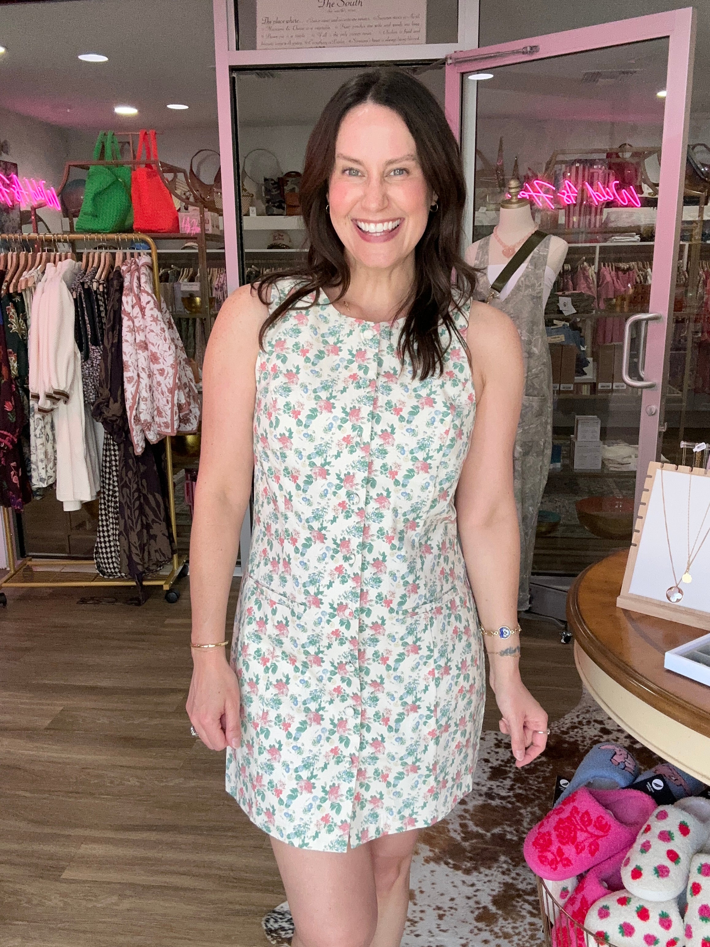 Fresh, easy, and effortlessly pretty — this cream base shift dress features a bright green and pink floral print that makes it perfect for spring and summer days. Designed with a button-down front and sleeveless cut, it has that easy throw-on-and-go feel while still looking polished. The shift fit keeps it comfortable and flattering for everyday wear, brunch, vacation, or dressing up with wedges.