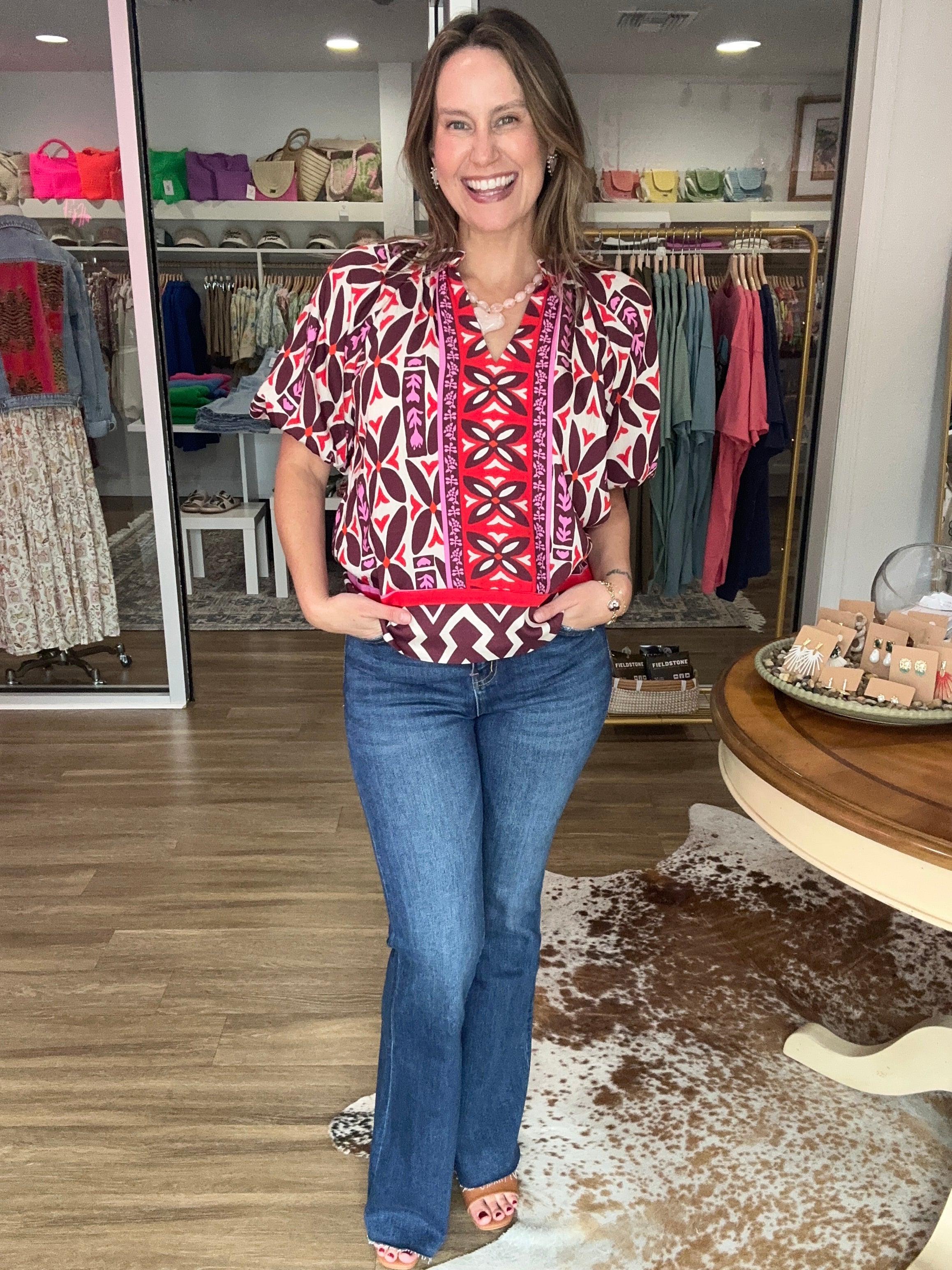 Chic and confident, The Harper Top features a bold burgundy, red, and white geometric print with puff sleeves and a flattering V-neckline. Lightweight and flowy, it’s the perfect mix of modern and feminine — easy to dress up for work or down for a weekend out.